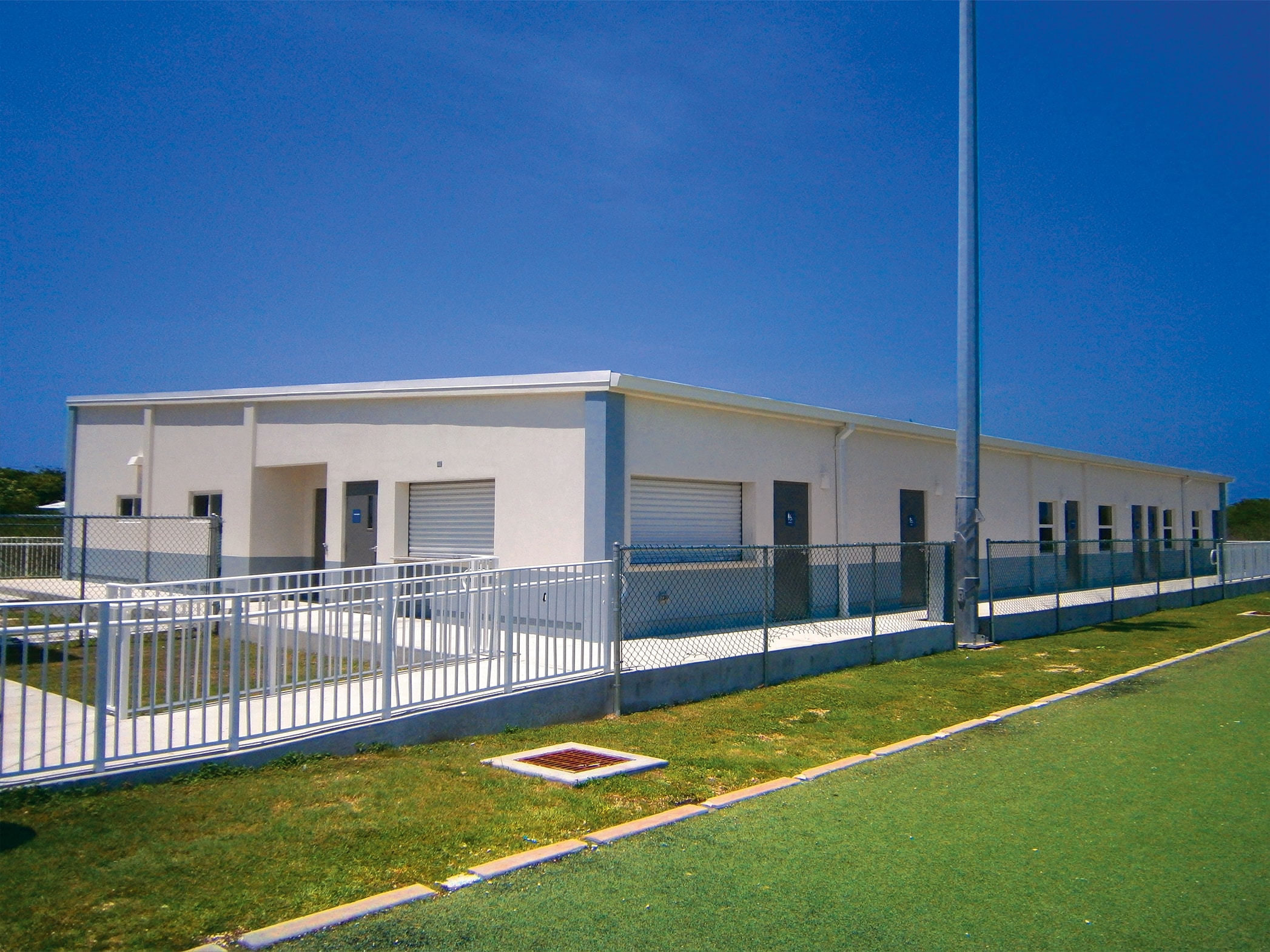 The Ministry of Health, Sports, Youth and Culture contracted Arch and Godfrey to design and build the changing room facility at the Ed Bush Stadium in West Bay in January 2014. The time-frame for this project was particularly short: planning permission was granted in February, construction commenced in April, and the project was completed by July of the same year. The 6,000 square foot facility includes two team dressing rooms with showers and bathrooms, press conference rooms, players’ medical room, coaches’ room, doping control room, referees’ room, VIP reception and a concession booth. The poured concrete metal deck roof also provides for the addition of stadium seating in the future.