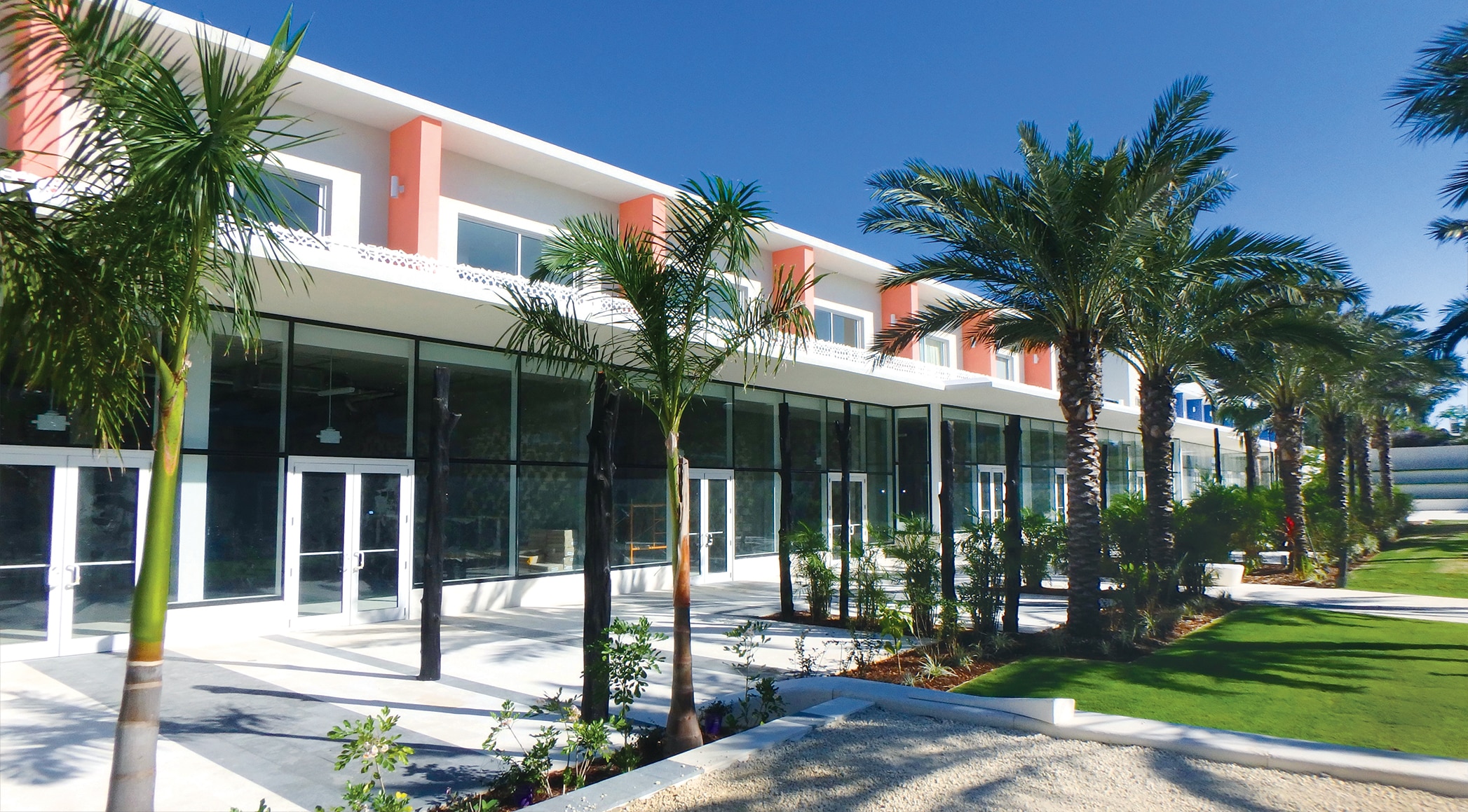 A mixed-use development on West Bay Road, The Grove is designed around a 1.5 acre plant-filled courtyard with fountains and seating areas. There are 35 commercial and retail spaces on the first floor, and 59 studio and one-bedroom apartments, with rooftop pools, on the second and third floors. The Grove is designed to Miami-Dade hurricane building code and elevated 12 feet above sea level with underground parking and rooftop solar arrays. Arch and Godfrey completed the development in 2020.